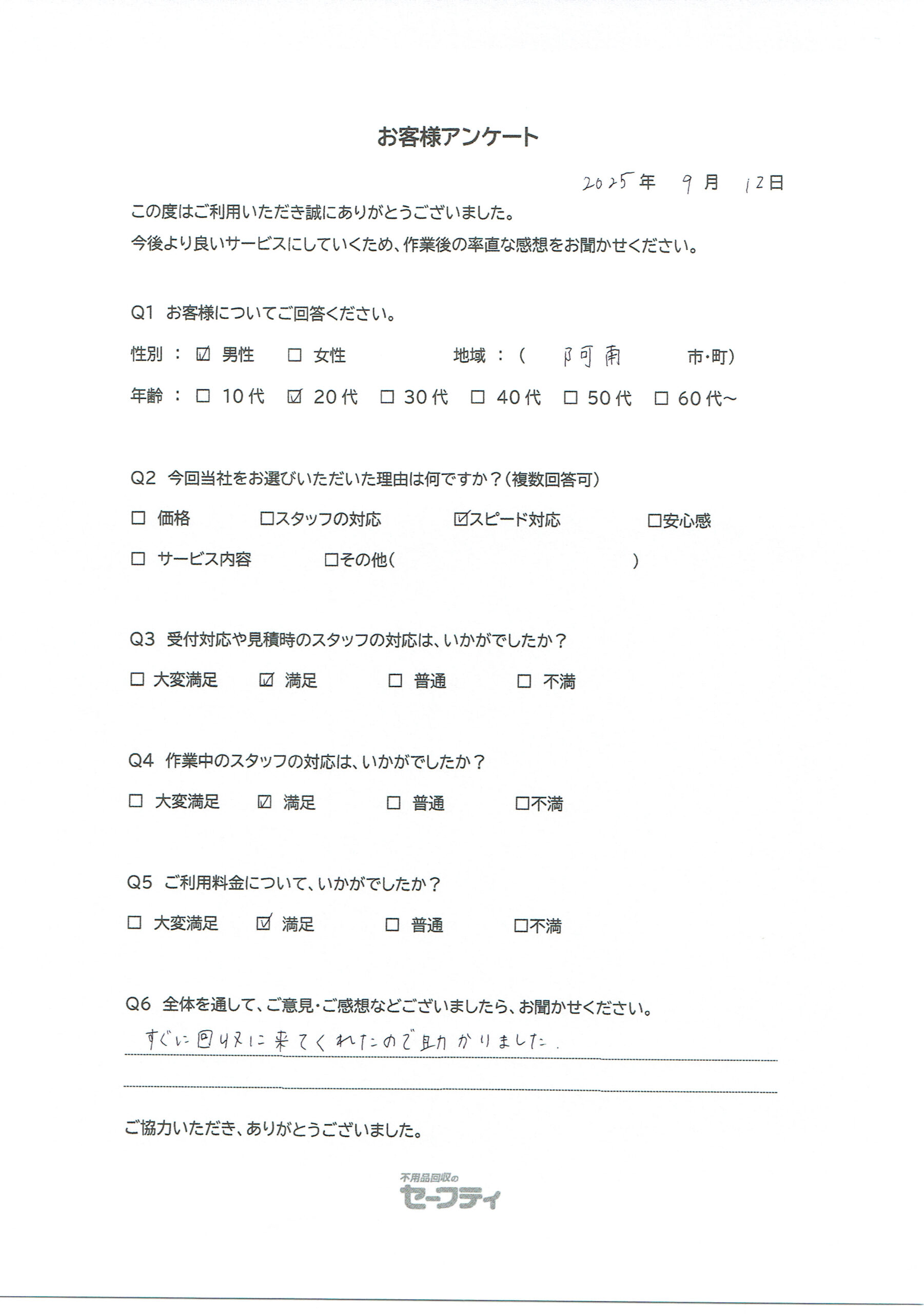 阿南市Aさま(引越しごみ回収ご利用のお客様アンケート)