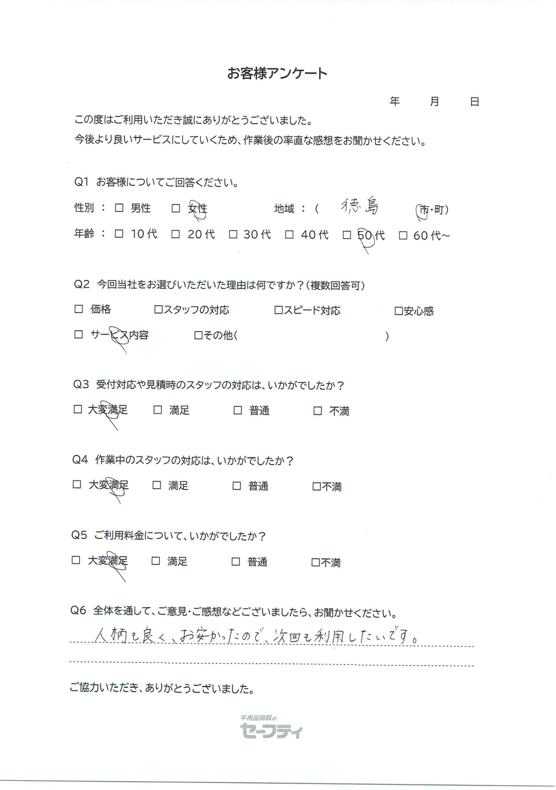 徳島市Sさま(生前整理ご利用のお客様アンケート)
